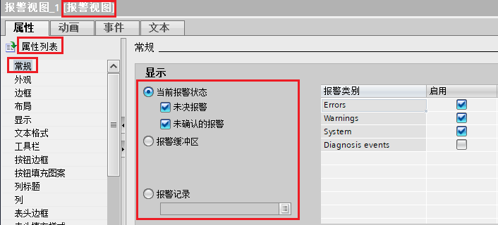 默认的类别中,Errors类别是带单次确认的报警,具有“到达/离开/确认”三种状态,而Warnings类别是不带确认的报警,只具有“到达/离开”两种状态。