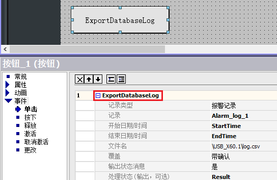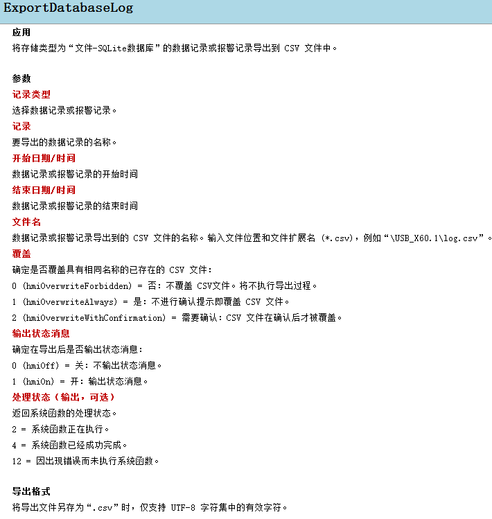 2. 可通过组态系统函数 ExportDatabaseLog 来将存储类型为 “文件-SQLite 数据库”的数据记录或报警记录导出到 csv 文件中。