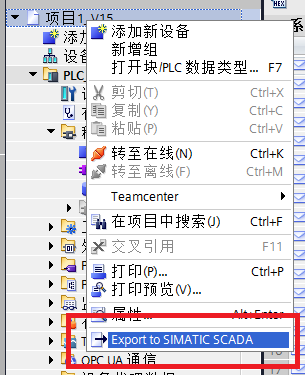 选择项目名称,点击鼠标右键,在弹出菜单中选择“Export to SIMATIC SCADA”