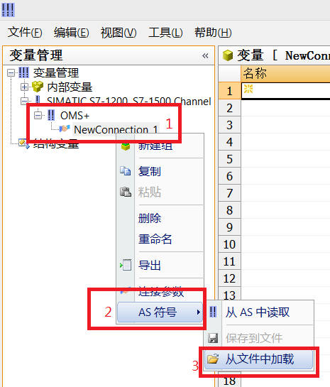把导出的zip文件复制到已安装WinCC V7.4SP1的电脑中。打开WinCC项目的变量管理器,选择需要导入变量的连接,点击鼠标右键,在弹出菜单中依次选择“AS符号”->“从文件中加载”。