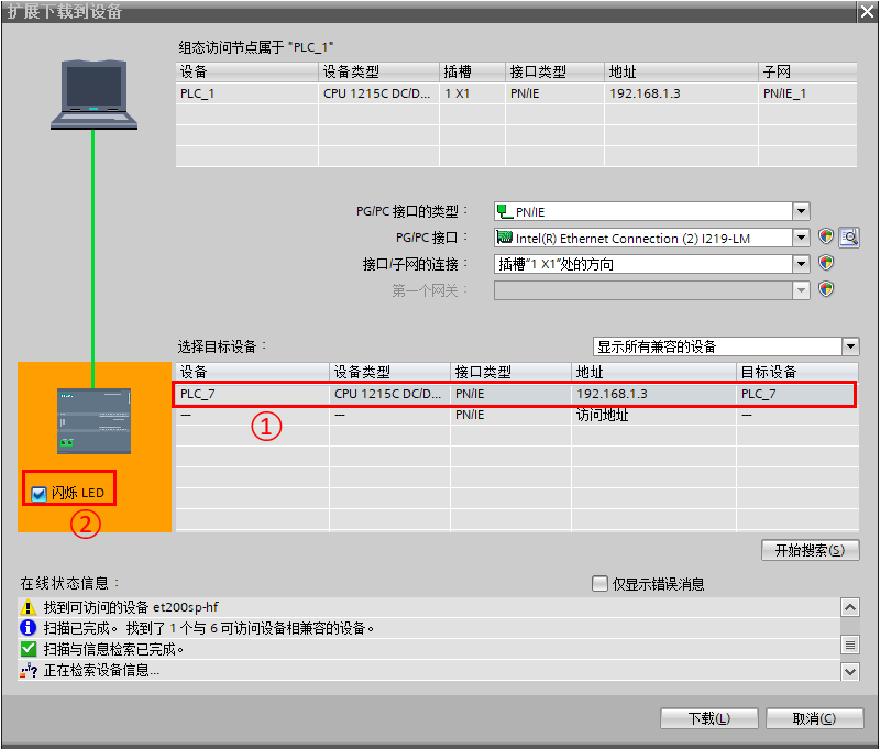 3.搜索到可访问的设备后,选择要下载的PLC,当网络上有多个S7-1200PLC时,通过"闪烁LED"来确认下载对象,点击"下载"按钮,如图04所示。
