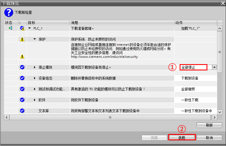 下载到设备等同于工具栏的下载按钮,当项目文件下载过后,项目会自动记录之前的下载行为,当点击下载到设备或者工具栏下载按钮,PC将直接和CPU建立连接,直接跳到如图07的下载预览页面。如果之前没有下载过项目文件,点击下载到设备或者工具栏下载按钮会跳到如图04的页面,需要设置接口,搜索等,然后才可以下载。