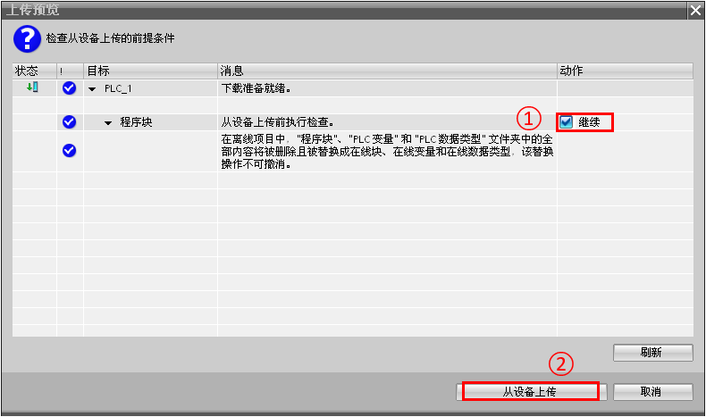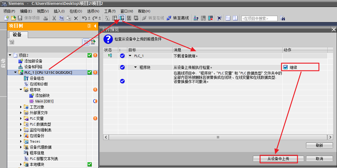 ②点击“从设备上传”执行程序上载,这时 CPU 里的程序便上载到离线的项目中了。
