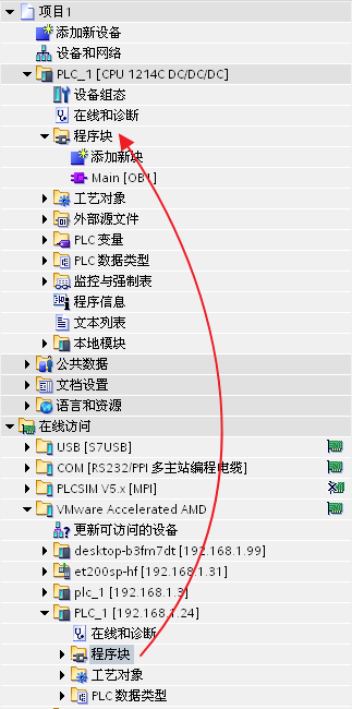 2、在在线访问的电脑网卡下双击“更新可访问的设备”,则会自动显示出电脑可访问到的设备,选择需要访问的PLC,展开目录,将程序块拖拽到离线的程序块,就会自动弹出上载对话框。