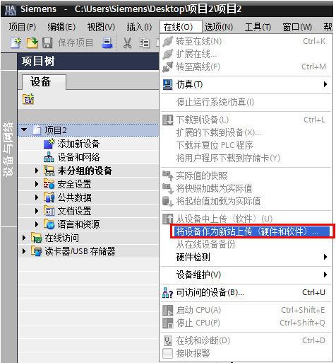 1、在项目树中选择项目名称。在“在线”菜单中,选择“将设备作为新站(硬件和软件)”。打开“将设备上传到 PG/PC”对话框。