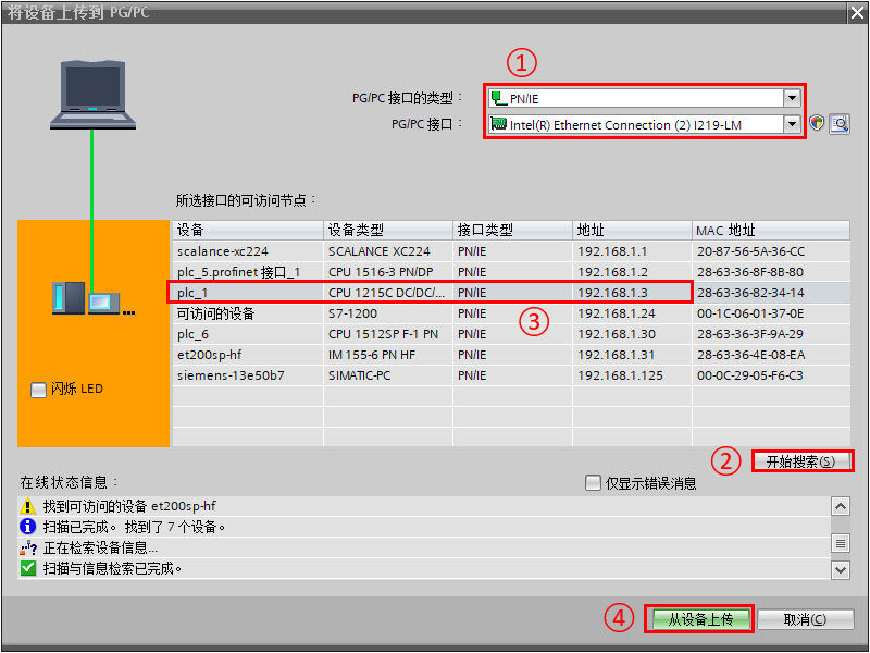 2、在“将设备上传到 PG/PC”对话框中执行以下操作