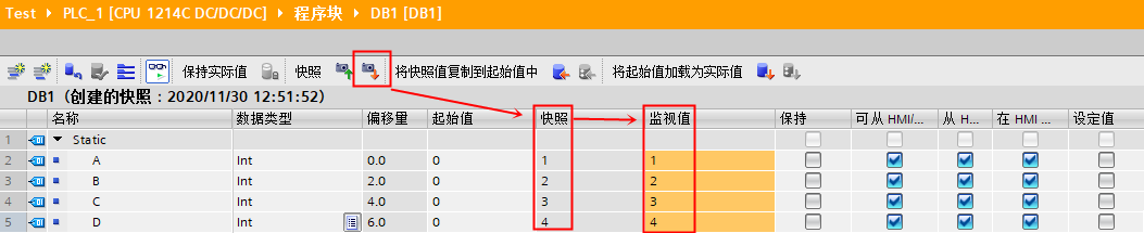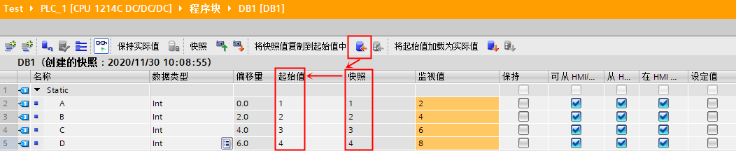 可以通过捕获 DB 块变量实际值快照用于恢复值操作,捕获的实际快照值可以复制到 CPU 中的实际值中,也可以用于替换变量的起始值。