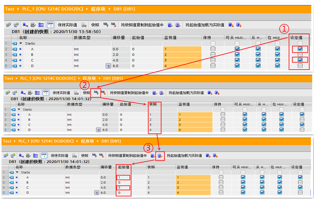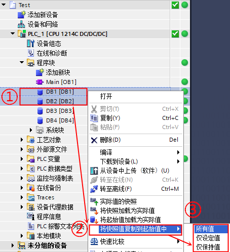 :将快照值复制到变量的起始值中,然后编译并将 DB 下载到 CPU 中后, DB 中没有设置保持性的变量会在 CPU 停止再重新启动后使用新起始值作为监视值。具体步骤参见图3所示。
