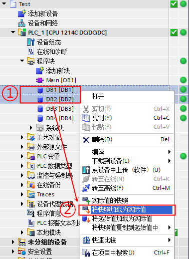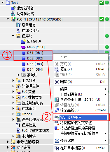 1、项目在线状态下,在项目树中选择 DB 块,可以单独选择块,或者在包含数据块的项目中选择设备、组或者文件夹。
