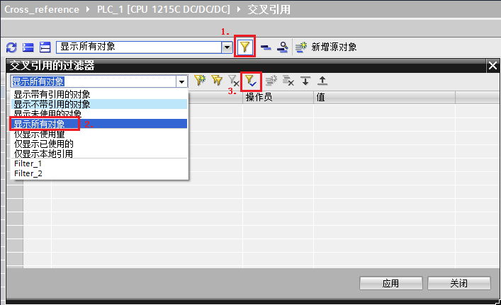 选择PLC_1文件夹,点击工具栏的交叉引用的按钮打开交叉引用窗口,将过滤器切换为自定义的Filter_3,交叉引用的结果及操作步骤如图9.所示。