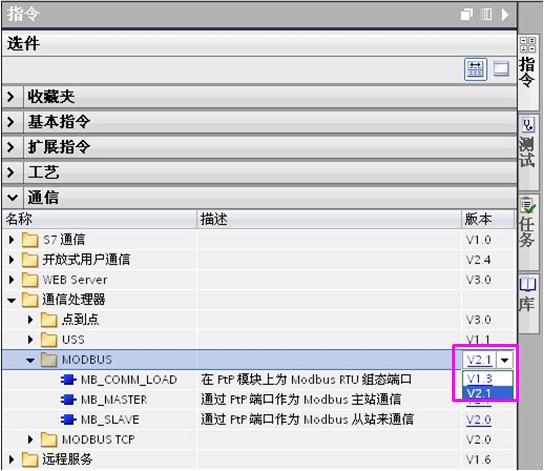 软件 STEP 7 V11版本开始,可以从“指令”→“通信处理器”→“MODBUS”下直接调用 “MB_COMM_LOAD”和“MB_MASTER”或“MB_SLAVE”指令,如下图1所示: