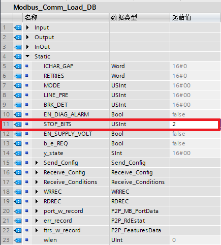 注意:S7-1200 CM1241/CB1241属性里可以设置停止位, 但是该模块用于 Modbus 通信时,此设置的停止位无效, 需要在 Modbus_Commload 指令的背景 DB 里 Static 修改 STOP_BITS停止位数值为 2。如下图 3, 4所示: