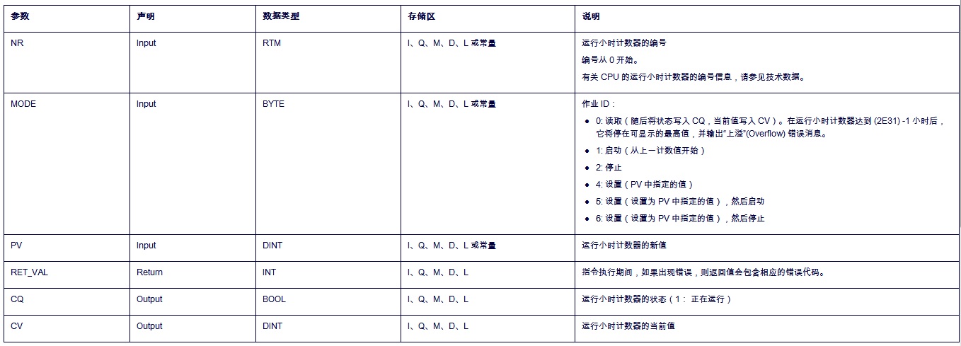 使用该指令对 S7-1200CPU 的 32 位运行小时计数器执行设置、启动、停止和读取操作。