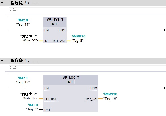 在OB1中编程,将DTL变量填写在输入管脚“IN”(设置系统时间指令)/“LOCTIME”(设置本地时间指令)。