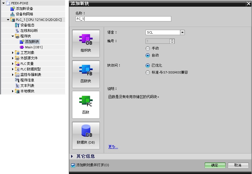 展开 PLC_1,双击“程序块”中的“添加新块”,选择语言“SCL”,添加 FC 块,名称为 FC_1 。