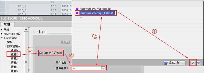 硬件中断事件包括内置数字输入端的上升沿和下降沿事件以及 HSC(高速计数器)事件。当发生硬件中断事件,硬件中断 OB 将中断正常的循环程序而优先执行。S7-1200可以在硬件配置的属性中预先定义硬件中断事件,一个硬件中断事件只允许对应一个硬件中断 OB ,而一个硬件中断 OB 可以分配给多个硬件中断事件。在 CPU 运行期间,可使用“ATTACH”附加指令和“DETACH”分离指令对中断事件重新分配。硬件中断 OB 的编号必须为40~47,或大于、等于123。