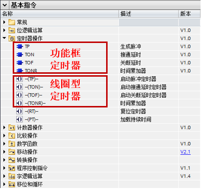 指令位置参见图1,定时器引脚参考表1,定时器使用及时序图参考表2。 这四种定时器又都有功能框和线圈型两种,区别参见常见问题3。