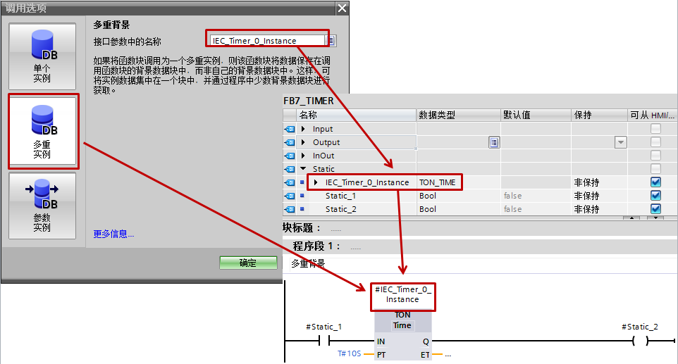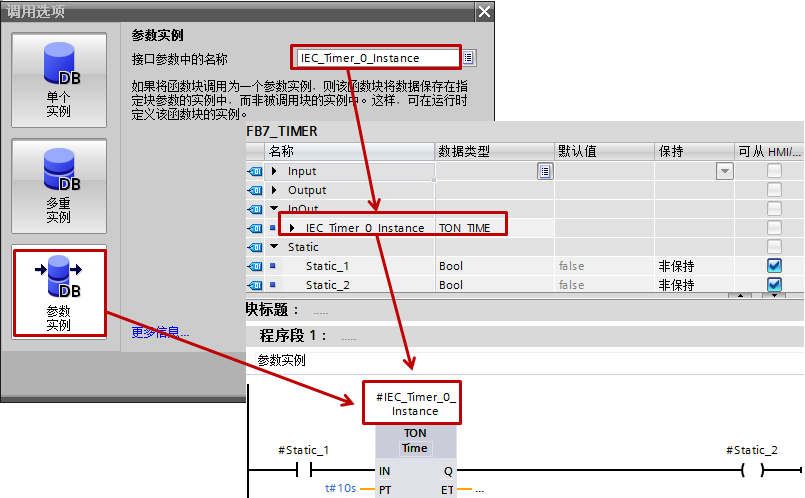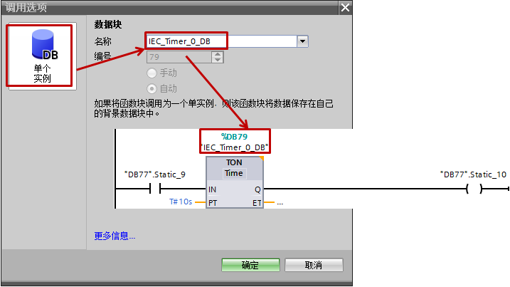 4. 在DB块、FB的静态变量、FC和FB的INOUT变量中新建IEC_TIMER、TP_TIME、TON_TIME、TOF_TIME、TONR_TIME(后面四个从TIA博途V11开始)类型变量,在程序中将功能框定时器指令拖入块中时,在弹出的“调用选项”页面点击“取消”按钮,之后将该建好的变量填入指定位置。对于线圈型指令,这是首选方法。