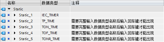 | IN | 输入位 | BOOL | TP、TON、TONR:0=禁用定时器,1=启用定时器 TOF:0=启用定时器,1=禁用定时器 |