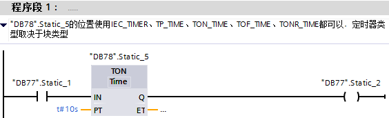 使用定时器需要使用定时器相关的背景数据块或者数据类型为IEC_TIMER(或TP_TIME、TON_TIME、TOF_TIME、TONR_TIME)的DB块变量,不同的上述变量代表着不同的定时器。