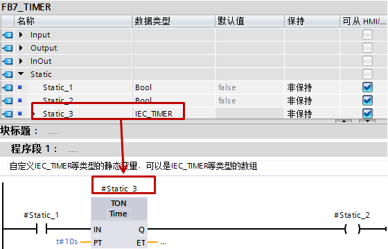(2) FB的静态变量中新建IEC_TIMER等类型变量(LAD/FBD),如果是IEC_TIMER等类型变量的数组,S7-1200从V2.0版本开始支持,参见图8。
