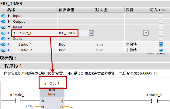 (3) FC和FB的INOUT变量中新建IEC_TIMER等类型变量(LAD/FBD),如果是IEC_TIMER等类型变量的数组,S7-1200从V2.0版本开始支持,从TIA博途V14开始支持IEC_TIMER等类型变量的变长数组(ARRAY[#]),参见图9。