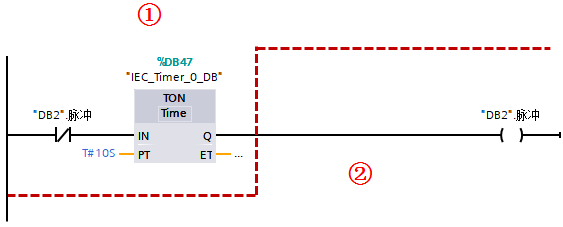 阶段1.初始"DB2".脉冲=False,于是"DB2".脉冲取反为True,触发计时器开始计时,输出的"DB2".脉冲=False,状态不变;定时时间不到,则始终在阶段1;