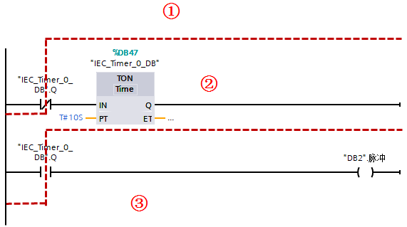 阶段2.当定时时间到发生在①所处的位置,在第一行的"IEC_Timer_0_DB".Q处定时器更新,更新后,"IEC_Timer_0_DB".Q=True,取反为False,此时作为TON的输入,使得定时器复位,第二行的"IEC_Timer_0_DB".Q=False,输出的"DB2".脉冲=False,到下周期时就回到了阶段1;