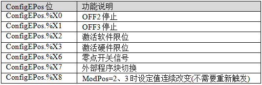| ConfigEPOS | DWORD | 可以通过此参数控制基本定位的相关功能,位的对应关系见下表 |