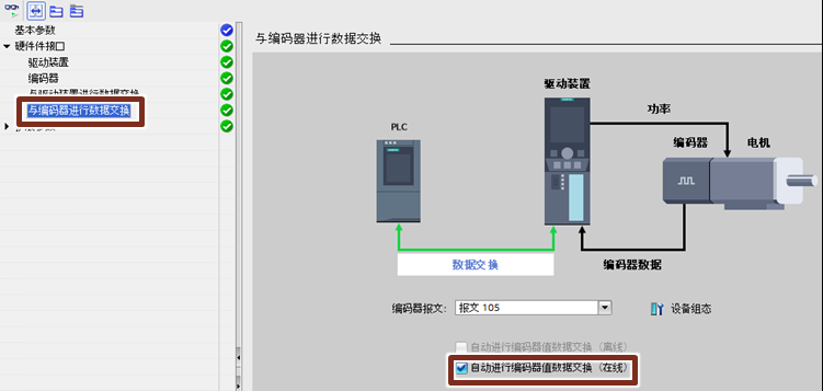 "与驱动装置进行连接"中,数据交换和信息传递通过集成组态的形式可以实现自动传递,默认采用的报文为西门子105,勾选"运行时自动应用驱动值(在线)":