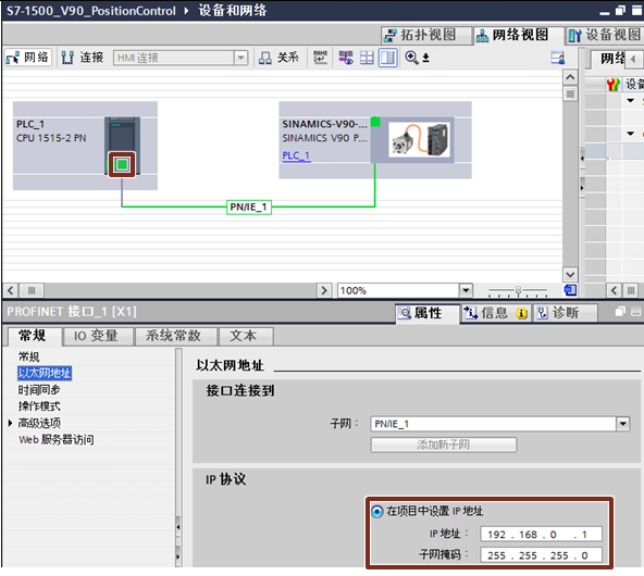 2. 建立V90 PN与PLC的网络连接,并分别设置S7-1500及V90 PN的IP地址及设备名称: