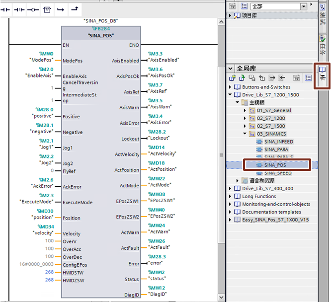 在OB1中将DriveLib_S7_1200_1500中的SINA_POS(FB284)功能块拖拽到编程网络中(此功能块只能与报文111配合使用),进行位置控制。