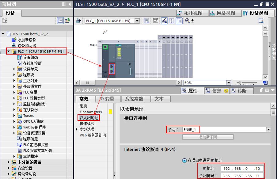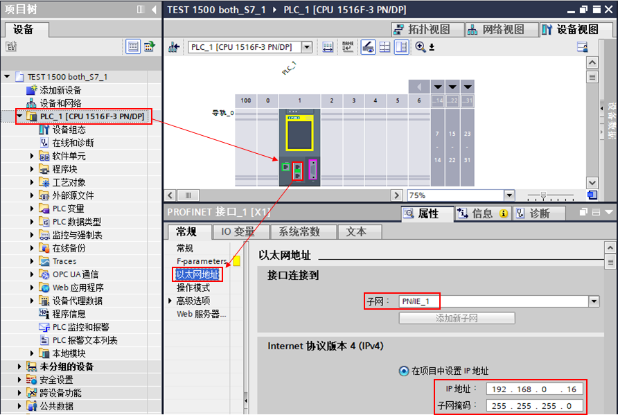 使用 TIA Portal 创建一个新项目,组态第一台 1516 CPU,并设置 IP 地址,如图1所示。