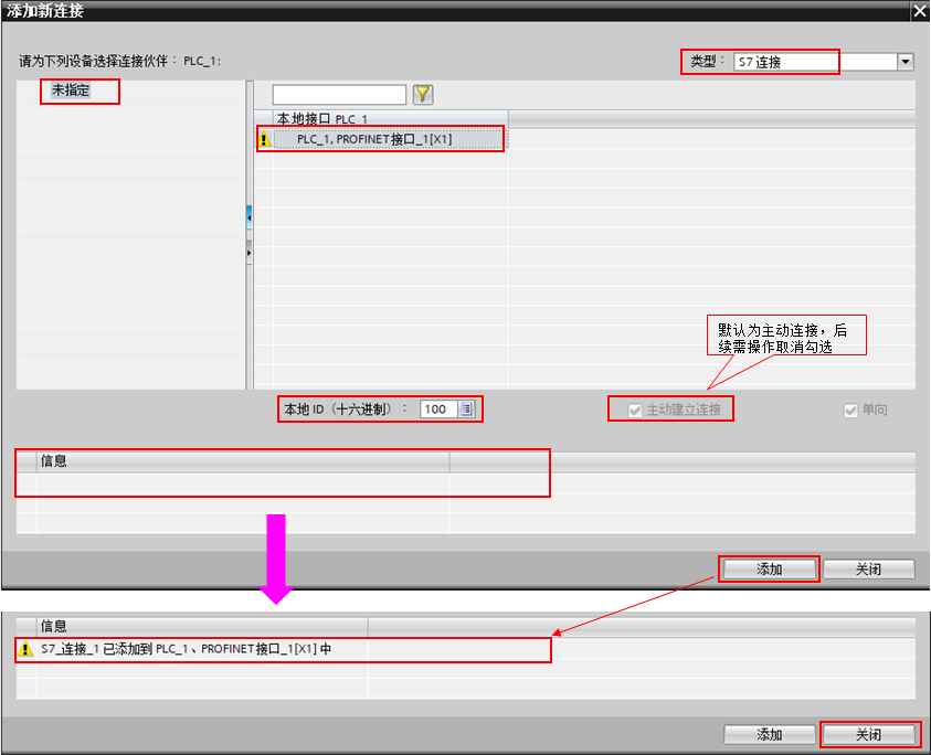在“添加新连接”的对话框中,选择连接对象"未指定",选择本地接口"PLC_1,PROFINET接口_1[X1]",默认为"主动建立连接",点击"添加"按钮,这时在"信息"栏能看到 S7 连接已添加的信息,点击"关闭"按钮,完成新连接的创建,如图10所示。