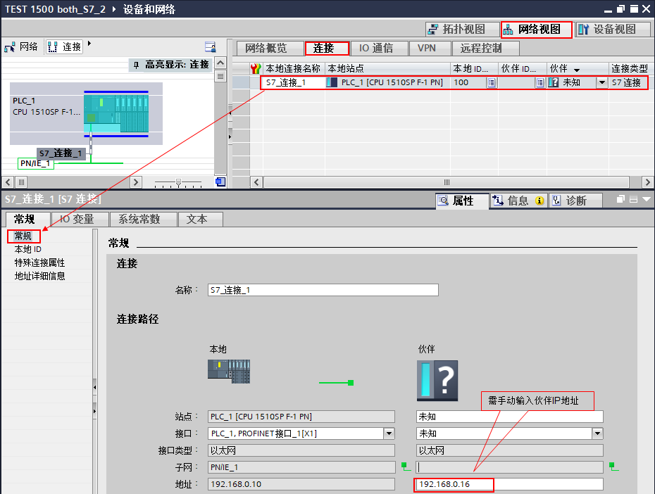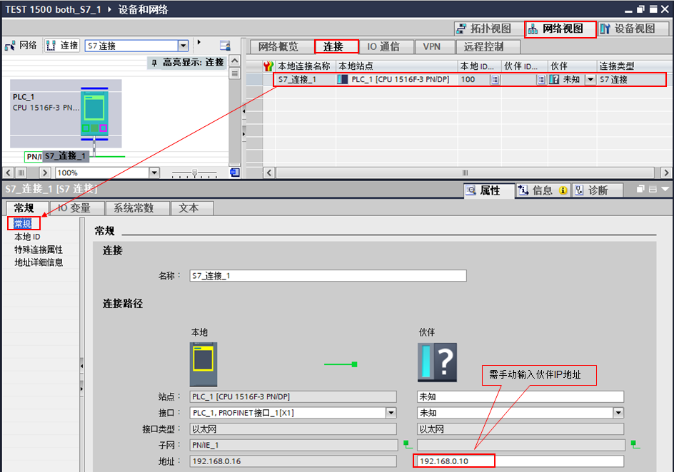 选择“连接”页面中的第一行,在下方的连接属性“常规”中,手动输入伙伴设备的 IP 地址,如图11所示。