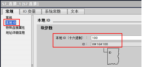 在“本地 ID”属性中,设置通讯连接的 ID 号,本地 ID 在本地 PLC 中必须是唯一的,在后续的通信编程中需要指向这个 ID,这里 1516 CPU 的 ID=W#16#100,如图5所示。
