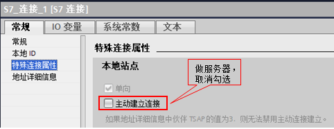 在“特殊连接属性”中,可以选择是否为主动建立连接。通信的双方只能有一方是主动建立连接,另一方是被动建立连接,这里 1510SP CPU 是被动建立连接(不勾选),如图14所示。