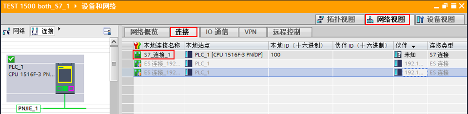 在"网络视图"中间栏的"连接"页面中,可以看到已经创建的"S7_连接_1"。