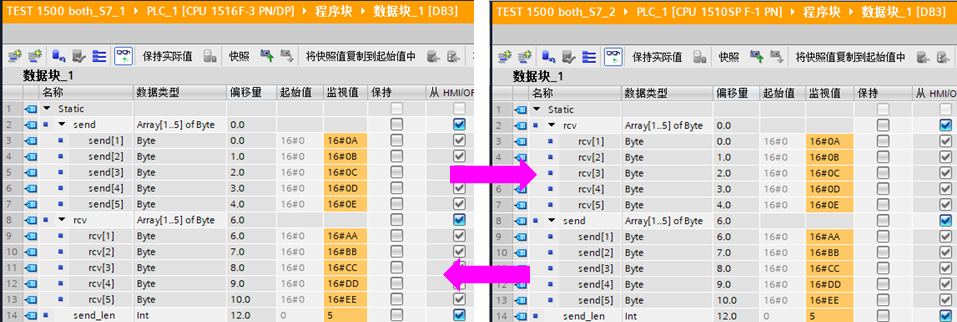 两台 PLC 的项目编译无错误后,分别将程序下载到各自的 CPU 中。1516 CPU 侧触发 M0.0 时,向1510SP CPU 发送一次数据;1510SP CPU 侧触发 M10.0 时,向1516 CPU 发送一次数据,如图21所示。