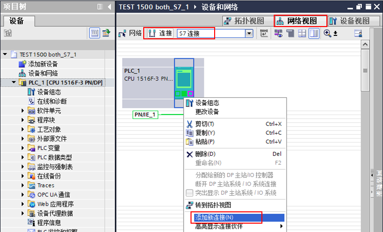 在"网络视图"中,点中左上角的"连接"图标,连接框中选择"S7连接",然后选中 S7-1500 CPU,右键选择"添加新的连接",如图2所示。