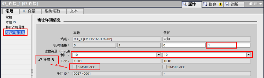 在“地址详细信息”属性中,设置通讯双方的 TSAP 号,伙伴的机架/插槽设置为 1516 CPU 所在的机架号和插槽号,在这里是0和1。因本例中使用 S7 双边连接,连接资源需设置为10,如图13所示。