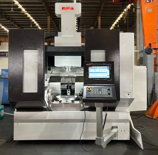 RFVU-50五轴立式加工中心采用天车式结构,三个直线轴加A/C摇篮转台组成五轴联动加工。
