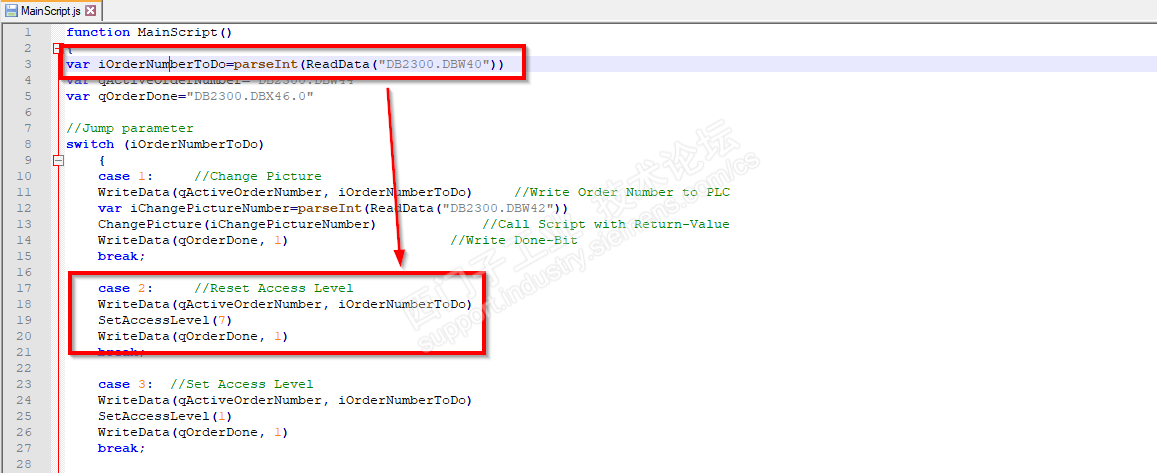 思路:首先屏幕变暗会激活DB19.DBX20.1 ,建立PLC与HMI直接的通讯信号(PLC侧DB2300.DBW40 ,HMI侧 iOrderNumberTodo),通过脚本文件使HMI接收到PLC信号后复位权限。