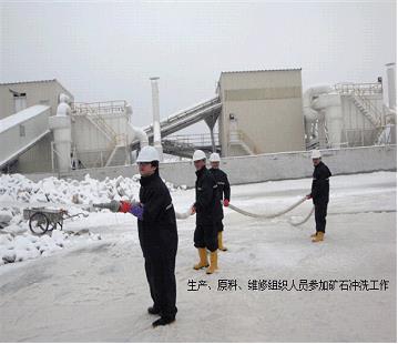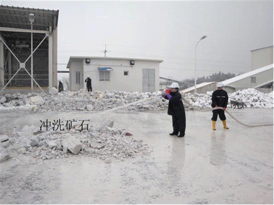经过商量大家拿出了一个方案,动用工厂里的消火栓及消防水管来冲掉矿石上的积雪。这样,大家不分彼此,配合相当默契。有的去拿消防水管,有的去拿大扫把,有的去装配消火栓接头。当一切准备就绪,不知谁一声令下,开水闸!顿时,白花花的水柱冲向矿石,水压挻大,需要几个人才能扛住消防水管。经过一个上午的努力,我们冲洗了大约两百多吨矿石。洗完矿石后,虽然当时天气较冷,但大家却汗流浃背。通过大家的努力,所清洗的矿石可以保证当天的生产(第二天还得继续)。
