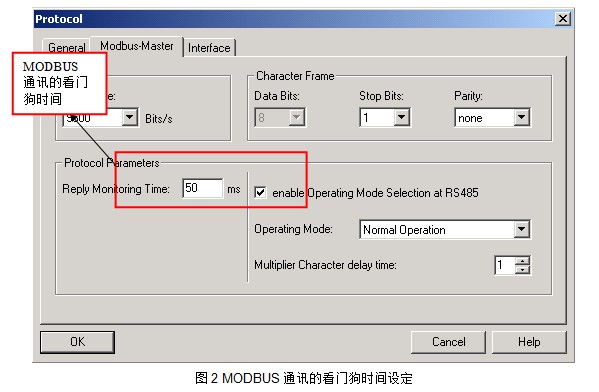 经过测试,我们发现,当该值设定小于50ms时,通讯会报错,因此,在该项目中,MODBUS信号的最小传输时间可以认为是50ms(图2)。