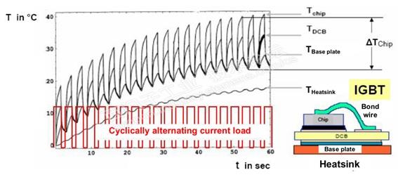下图1是IGBT模块的内部设计和在周期性交变电流负载时IGBT芯片、基板和散热片的温度特性曲线。