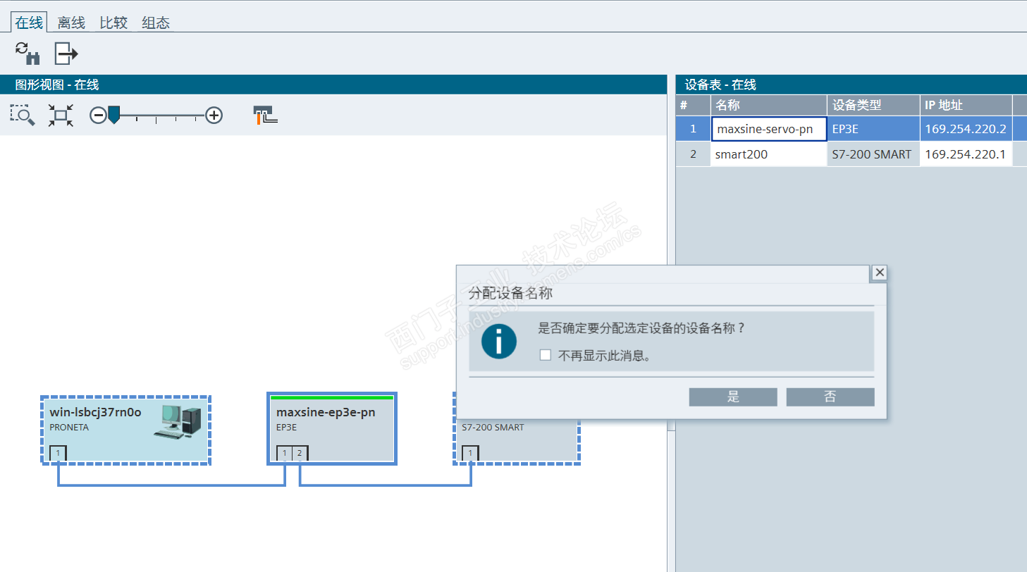当硬件连接好以后我们可以用PRONETA (或者直接使用博途)修改伺服名称和IP地址