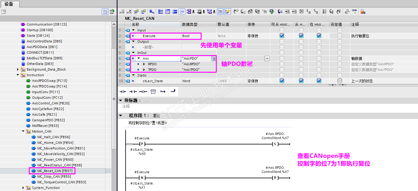 最终编写轴常用的功能块,如使能、复位、停止、位置模式运动、速度模式运动、回零模式运动和轴状态读写功能块等,以一个简单的“复位”功能块为实例,如下图所示: