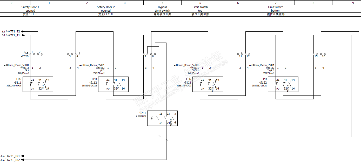 设备使用了两个3SK1安全继电器,见下面图纸,-K771安全继电器的输入通道为安全门1位置开关、安全门2位置开关,设备动作的限位开关串联,双通道连接,旁路限位开关(自复位型)用于当设备触发限位开关时,用于屏蔽限位开关,手动操作设备,主要用于维护,平时处于断开状态。