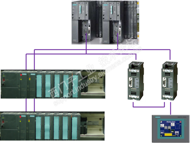 北京某国营宾馆有一套2007年投产的水处理设施,采用S7-400H冗余CPU+IM153-2远程IO的配置方式,监控设备包括2台上位机和一台触摸屏。2台上位机配置CP1613网卡与CPU进行冗余的以太网通讯,唯独触摸屏没有以太网接口,而是采用2个485中继器搭接了一个路由连接到触摸屏的485接口,详见下图。